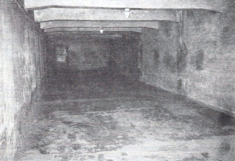 At Auschwitz, the supposed gas chamber of Crematory I (see Figure 2), which is the place most frequently visited, merits special attention. This area was initially a mortuary (Leichenhalle); in June of 1943 it was converted into an “anti-aircraft shelter for the SS infirmary, complete with an operating room” (Luftschutzbunker für SS Revier mit ein em Operationsraum).[7] The Germans then constructed a number of partition walls within the room to protect it against shock waves from the bombs. After the war, the Museum authorities tore down the partitions in order to give the area a feeling of greater capacity. However, traces of these partitions are still visible on the walls and floor. The miserable dim lighting of the place is no doubt for the purpose of hiding the modifications made after the war.